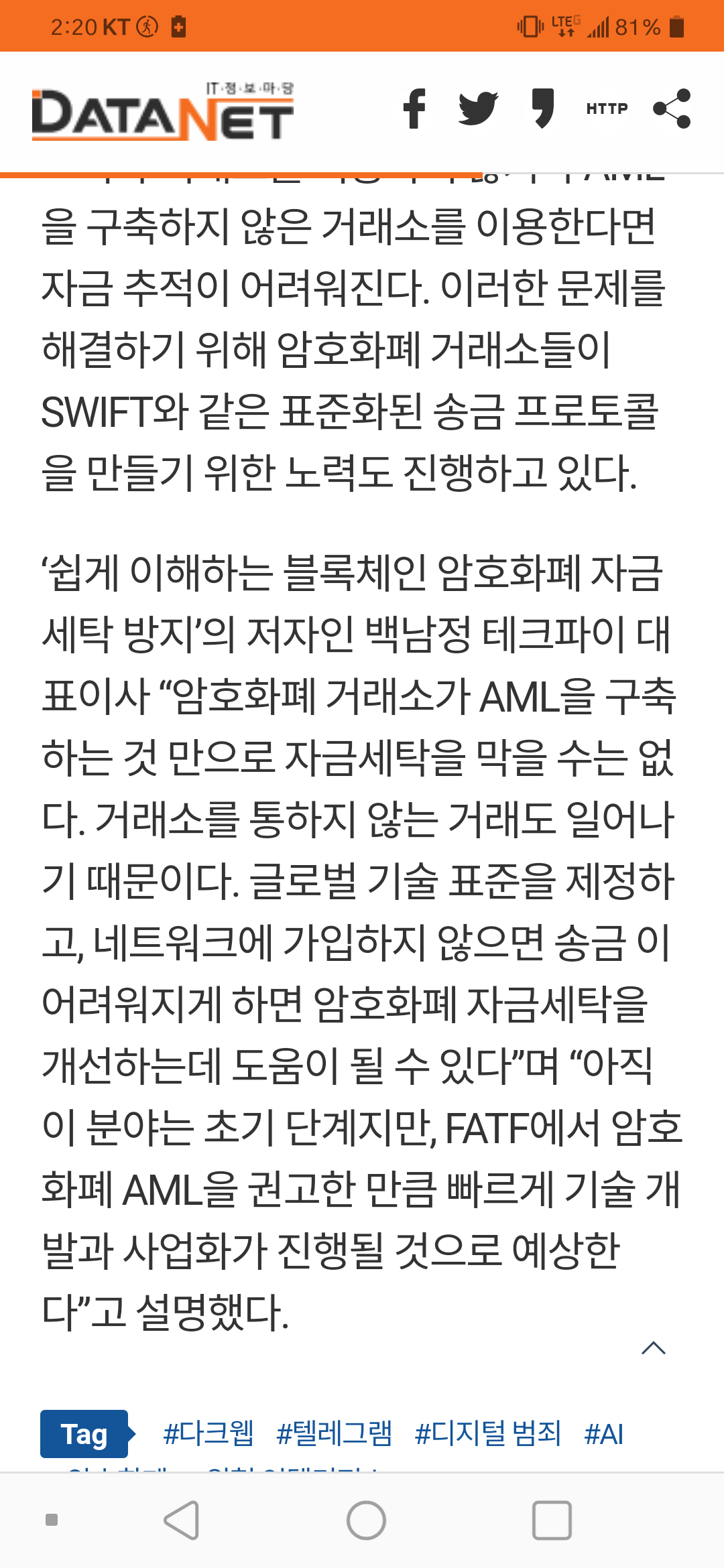 쉽게 이해하는 블록체인 암호화폐 자금세탁 방지’의 저자인 백남정 테크파이 대표이사 “암호화폐 거래소가 AML을 구축하는 것 만으로 자금세탁을 막을 수는 없다. 거래소를 통하지 않는 거래도 일어나기 때문이다. 글로벌 기술 표준을 제정하고, 네트워크에 가입하지 않으면 송금 이 어려워지게 하면 암호화폐 자금세탁을 개선하는데 도움이 될 수 있다”며 “아직 이 분야는 초기 단계지만, FATF에서 암호화폐 AML을 권고한 만큼 빠르게 기술 개발과 사업화가 진행될 것으로 예상한다”고 설명했다.