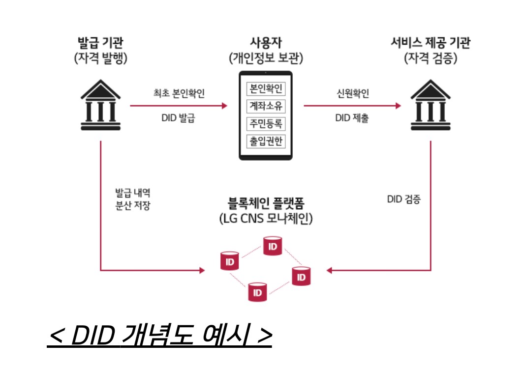 DID는 블록체인 기술로 개인의 신원을 증명하는 기술이다. 한 번의 신원인증으로 다양한 기관의 서비스를 추가인증 없이 이용할 수 있다. 최근 폐지된 공인인증서를 대체할 기술로도 각광받고 있다.