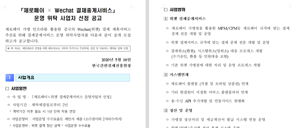 제로페이 X 위챗 결제중계서비스 운영 위탁사업자 선정