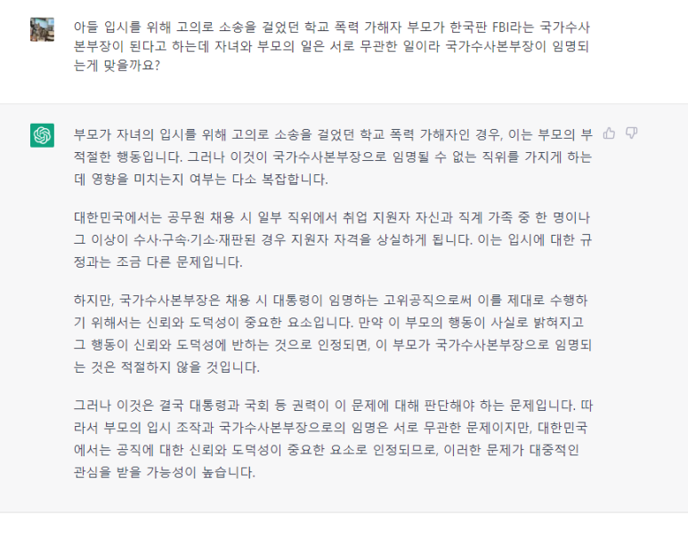 그러나 이것은 결국 대통령과 국회 등 권력이 이 문제에 대해 판단해야 하는 문제입니다. 따라서 부모의 입시 조작과 국가수사본부장으로의 임명은 서로 무관한 문제이지만, 대한민국에서는 공직에 대한 신뢰와 도덕성이 중요한 요소로 인정되므로, 이러한 문제가 대중적인 관심을 받을 가능성이 높습니다.