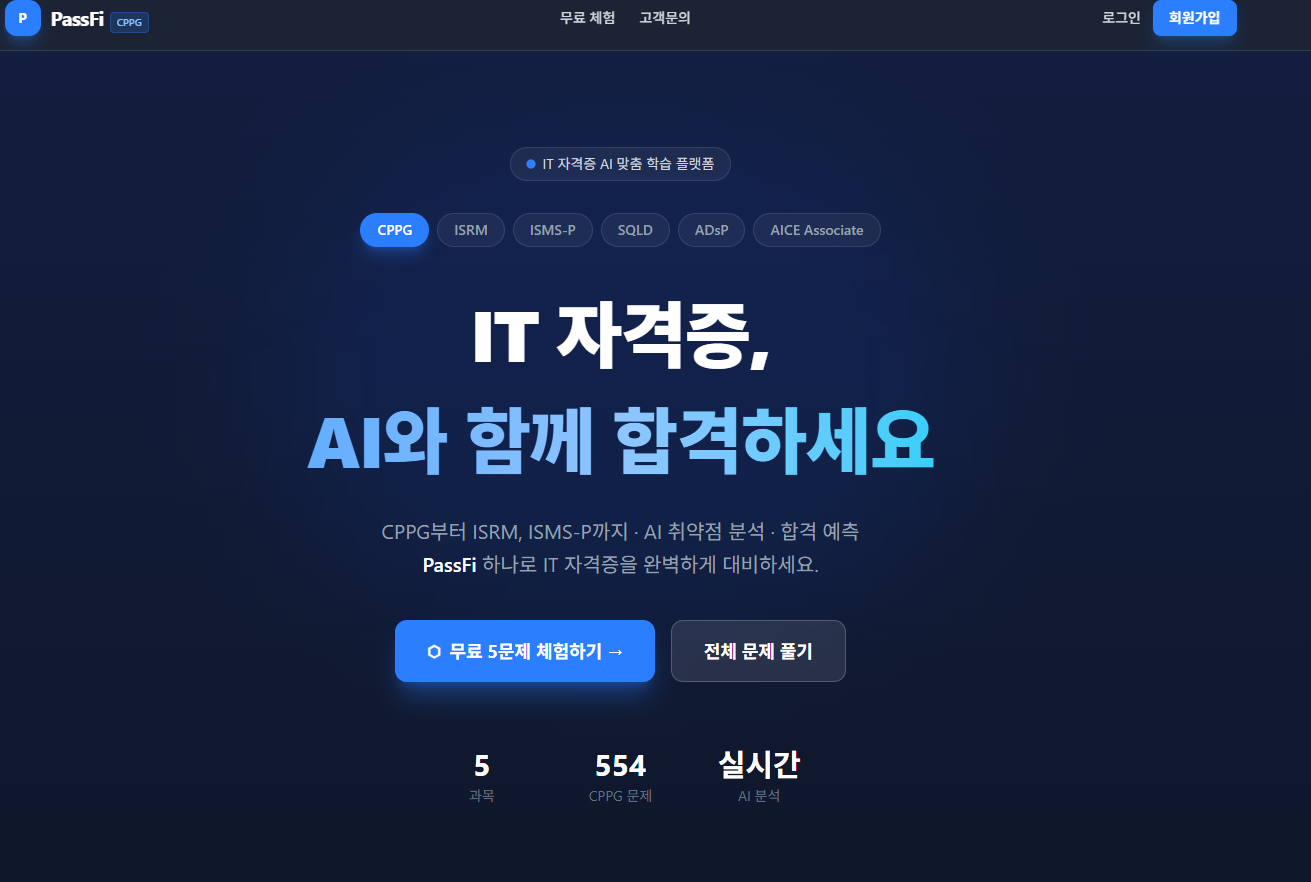CPPG, ISMS-P, SQLD, ADsP 등 IT 자격증 AI 분석 · 합격 예측 · 문제은행 서비스.